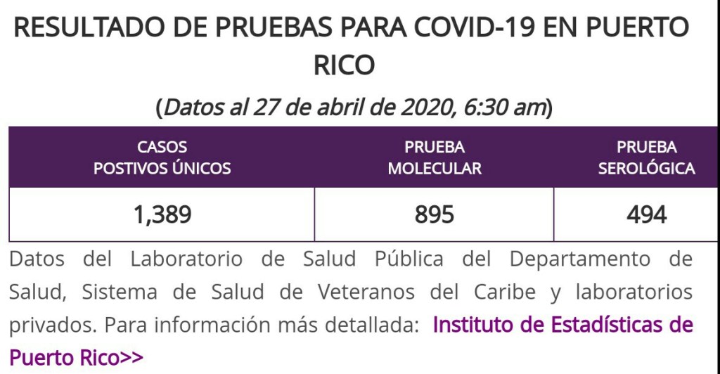 Aumentan los casos de contagios de coronavirus en Puerto Rico a 1,389 Los casos de contagios aumentaron en la isla con casi 20 casos más,mientras las muertes se mantienen en 84 según los datos del Departamento de Salud . Incluimos su informe de casos registrados hasta el momento… Compártelo: Compartir en X (Se abre en una ventana nueva) X Comparte en Facebook (Se abre en una ventana nueva) Facebook Me gusta Cargando... Relacionado