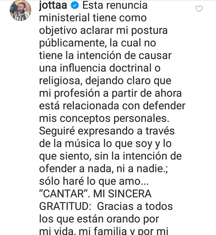 Se retira de la musica cristiana o gospel Jottaa Estas fueron algunas de sus propias expresiones,luego de declararse abiertamente homosexual.Nuestras oraciones por este joven… Compártelo: Compartir en X (Se abre en una ventana nueva) X Comparte en Facebook (Se abre en una ventana nueva) Facebook Me gusta Cargando... Relacionado