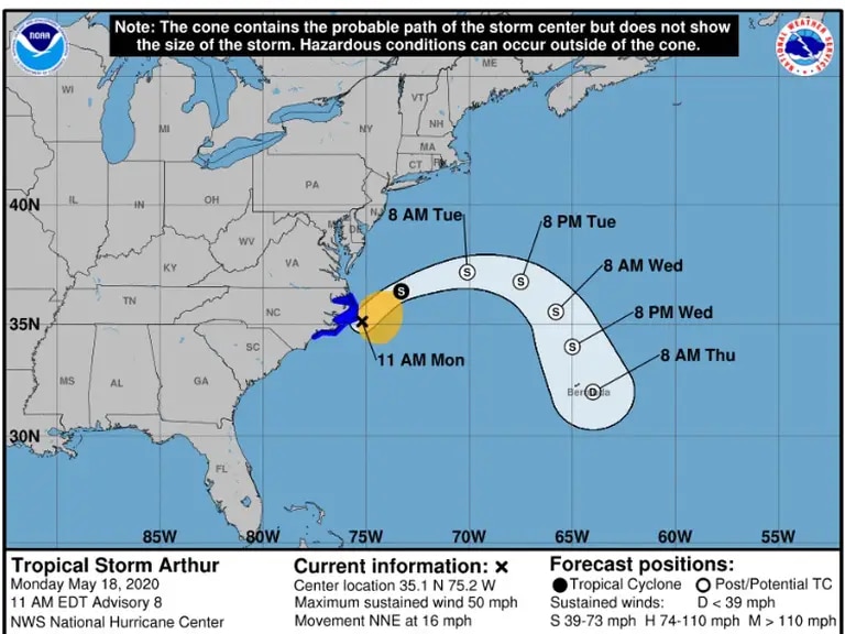 Las peores previsiones de los meteorólogos se han cumplido, y el centro de Arthur, la primera tormenta tropical de la temporada de huracanes atlántica, avanza peligrosamente hacia Carolina del Norte.