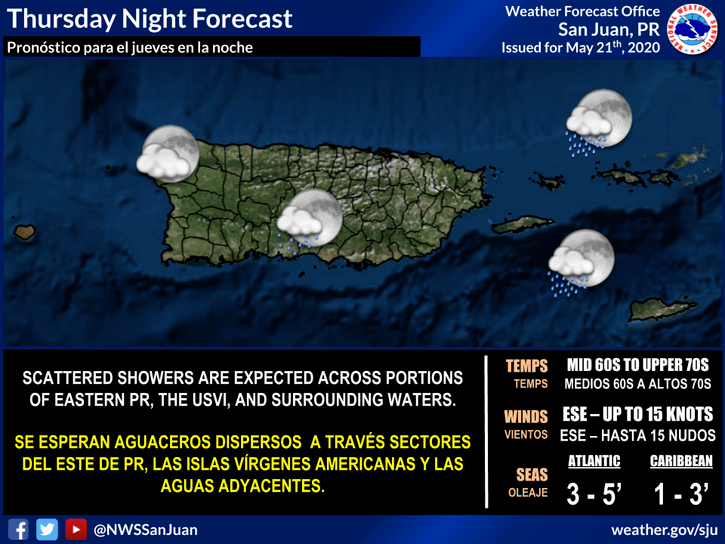 Se esperan lluvias dispersas en las secciones orientales de PR, las aguas locales y las Islas Vírgenes de EE. UU. Duchas aisladas posibles en otros lugares. Se anticipan mares de hasta 5 pies para las aguas atlánticas locales, y hasta 3 pies para el Caribe, con vientos de hasta 15 nudos.SNM.