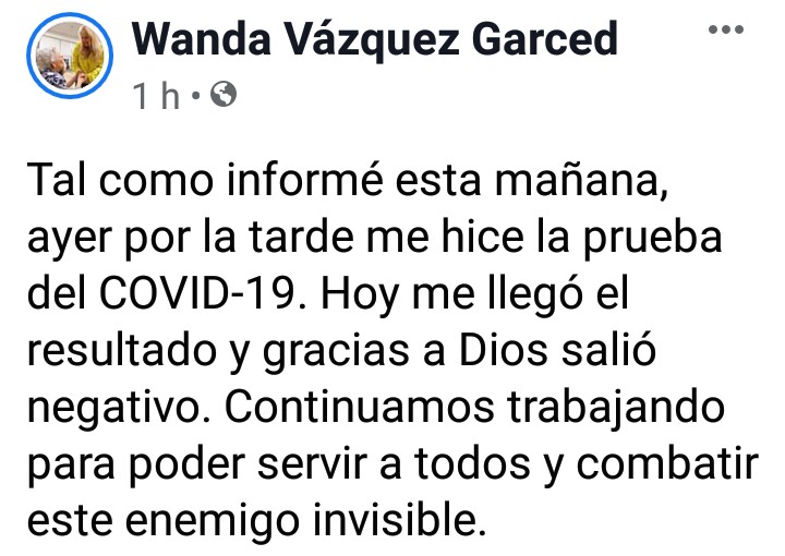 La gobernadora de Puerto Rico Wanda Vazquez Garced,fue sometida a pruebas del coronavirus los cuales salieron negativos.Estas fueron sus expresiones.