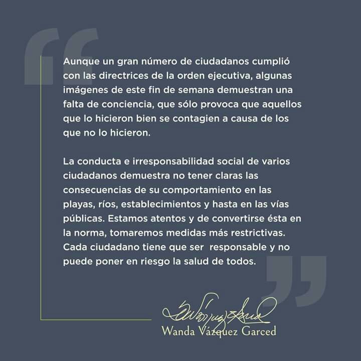 Por gente que no están protegiéndose y están siendo irresponsables con la nueva orden de reapertura,podría establecerse mas estrictas restricciones esto advirtió la gobernadora Wanda Vazquez Garced esta tarde.