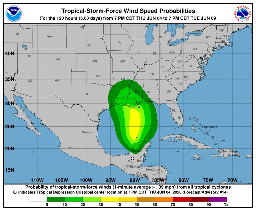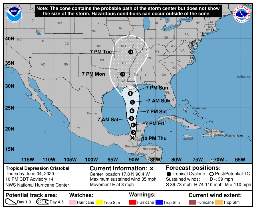 Cristobal tiene actualmente vientos sostenidos de 35 mph ,se espera que se fortalezca nuevamente y cobre fuerza de Tormenta Tropical dirigiéndose a los Estados Unidos.