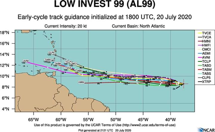 El invest 99L es una baja presión cerca de ~lat 9°N ~long 38°O que aún cuando tiene alguna circulación, está débil. Cuando llegue más cerca de Antillas, pasará como onda tropical localmente entre viernes y sábado. Espero buenas lluvias de este evento».concluyo .