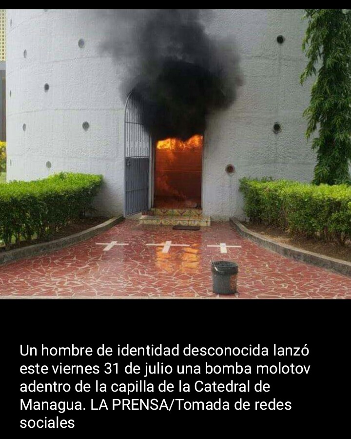 Un hombre de identidad desconocida lanzó este viernes 31 de julio una bomba molotov adentro de la capilla de la Catedral de Managua, lo que provocó un incendio que ya fue controlado por los bomberos.
