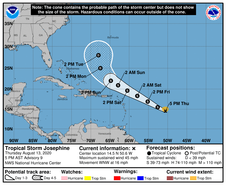 Con vientos máximos sostenidos de 45 mph ,la Tormenta Josefhine se mueve sobre el atlantico central a 16 mph.Se espera que continúe su movimiento oeste noroeste ,por lo que no se espera que afecte este sistema directamente las Antillas Menores o Puerto Rico.Si el efecto indirecto en el mar y lluvias asociadas entre el Domingo y lunes.