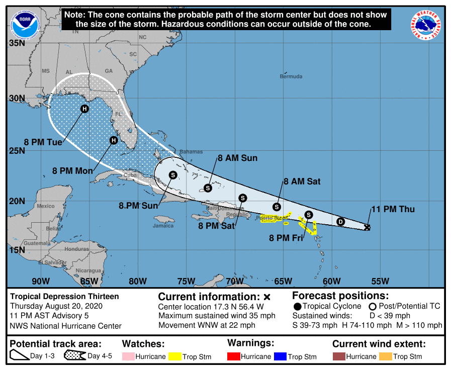 Depresión Tropical #13 continua su rumbo oeste noreste pasara su eje un poco mas cerca de Puerto Rico este sabado con vientos sostenidos de 40-45 mph