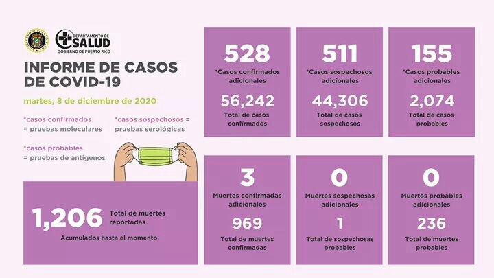 El informe del Departamento de Salud reportó tres muertes por COVID-19; mientras, se registraron 528 casos confirmados, 155 casos probables y 511 casos sospechosos adicionales. Es importante recordar que cualquier muerte registrada luego de emitido el reporte, se verá reflejada en informes posteriores.