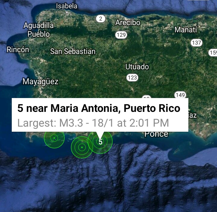 En el día de hoy se han reportado varios sismos sentidos pero leves en la zona suroeste del pais.Segun la red Sismica de Puerto Rico a eso de las 3:01 pm se registró uno de 3.3 de magnitud al suroeste de Yauco .La zona de Guanica sigue siendo el epicentro de miles de temblores por varias fallas téctonicas entre ellas la llamada «Montalva».