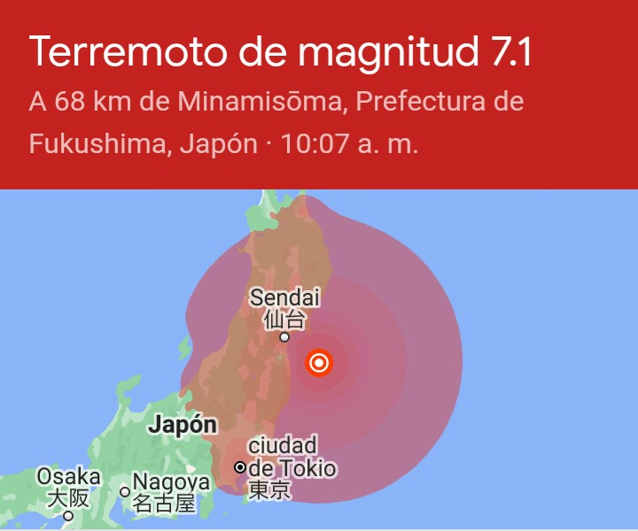 El terremoto fue de 7.1 de magnitud según la escala Ritcher epicentro en la costa de Fikushima.Se noto con fuerza en Tokio.No se activo el alerta de Tsunami.