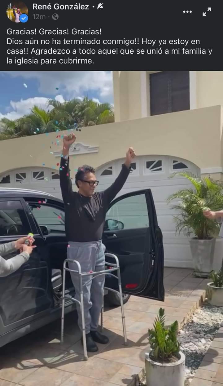 Hoy el periodista Jeremy Ortiz dijo:“En casa” René González. Luego de más de tres semanas hospitalizado por complicaciones tras una operación debido a una caída, el pastor y cantante cristiano informó que fue dado de alta.»concluyó.