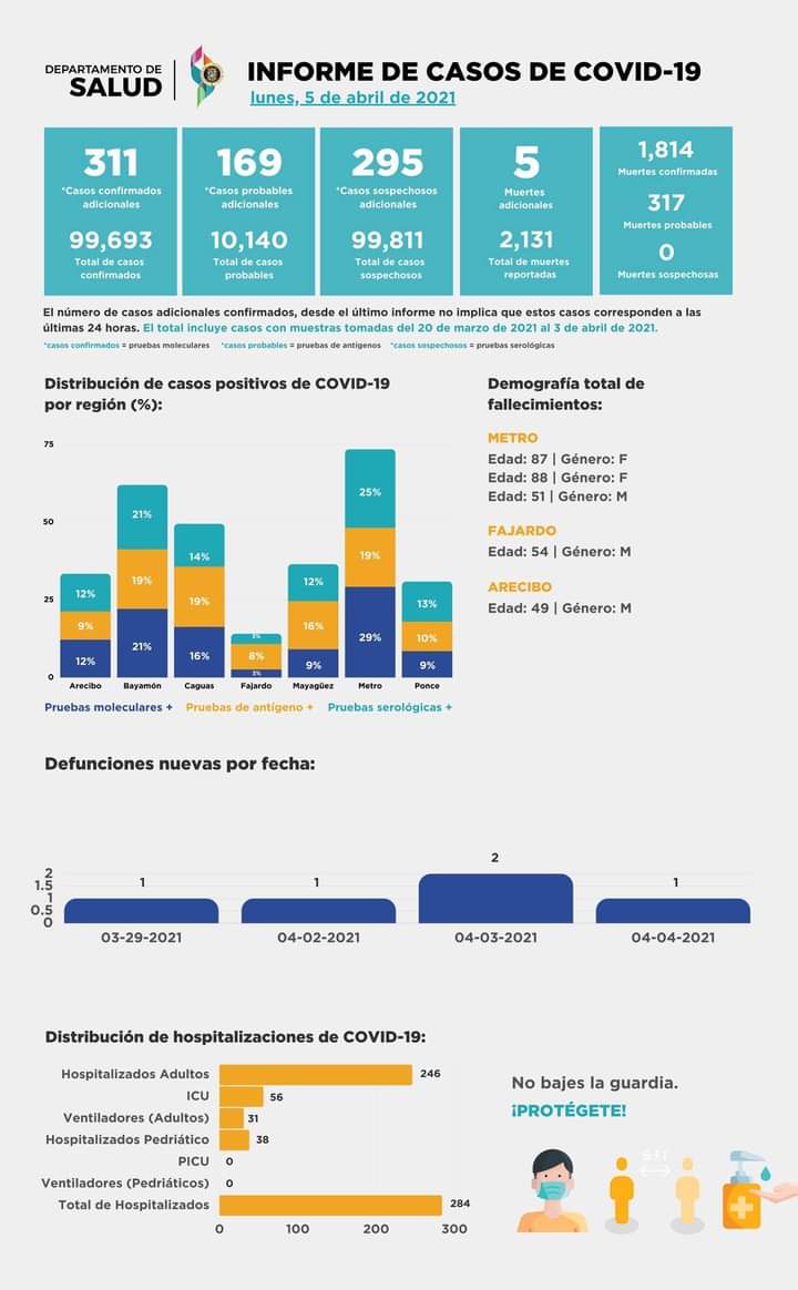 Se reportan 311 nuevos casos positivos con pruebas moleculares. 284 personas están hospitalizadas, de los cuales 31 adultos se encuentran en ventilador. Se reportan cinco decesos a causa del COVID-19. Es momento de reforzar los protocolos de prevención para evitar contagios. ¡No podemos bajar la guardia!