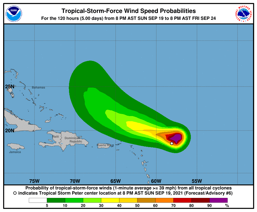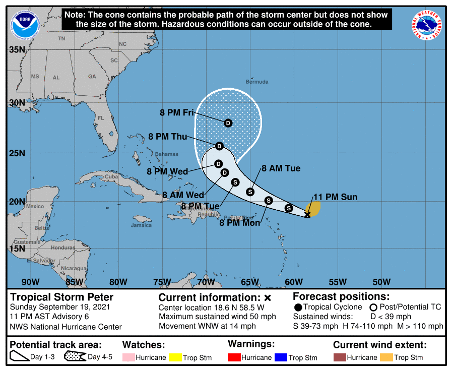 EL CNH ESTA EMITIENDO ADVERTENCIAS SOBRE LA TORMENTA TROPICAL PETER ,SOBRE LA TORMENTA TROPICAL ROSE Y DOS ONDAS TROPICALES CON PROBABILIDAD DE BAJA A MEDIANA FORMACION EN 5 DIAS.LLUVIAS DE HASTA 3 O 4 PULGADAS SON POSIBLES EN ALGUNAS ISLAS DEL NORTE DE LAS ANTILLAS MENORES Y PUERTO RICO,ADEMAS DE FUERTE OLEAJE EN AGUAS DEL ATLANTICO Y PLAYAS DEL NORTE Y ESTE DE PUERTO RICO.
