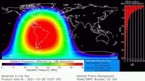 La Eyección de Masa Coronal (CMC) que actualmente de dirige a la tierra, está prevista para llegar el 31/10/21 alrededor del medio día. Esta CME podría ser de clase G1 (menor) o G3 (fuerte) La tormenta debe ser Geomática y perturbará el campo magnético de la tierra.