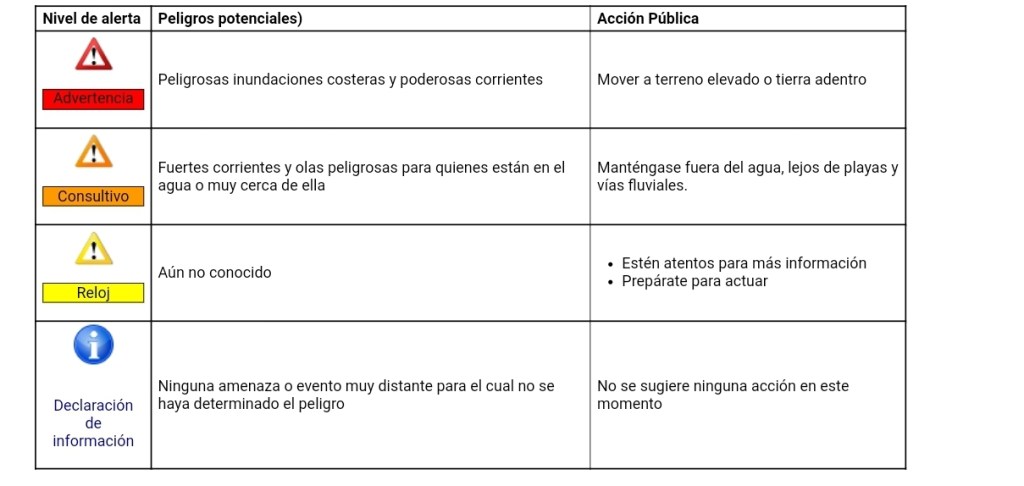 Los mensajes nacionales de tsunami se emiten para las costas de EE. UU. y Canadá y las Islas Vírgenes Británicas. Estos mensajes incluyen alertas y también sirven para cancelar alertas, cuando corresponda. Hay cuatro niveles de alertas de tsunami: advertencia, aviso, vigilancia y declaración de información. Cada uno tiene un significado distinto relacionado con la respuesta de emergencia local. Las acciones protectoras recomendadas varían dentro de las áreas bajo advertencias y avisos. Esté alerta y siga las instrucciones de los funcionarios locales de emergencia porque pueden tener información más detallada o específica.Nivel de alertaPeligros potenciales)Acción Pública