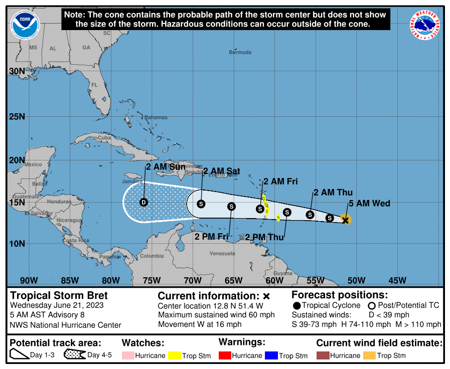 ➡️ Tormenta Tropical Bret esta cobrando un poco más de intensidad en vientos
