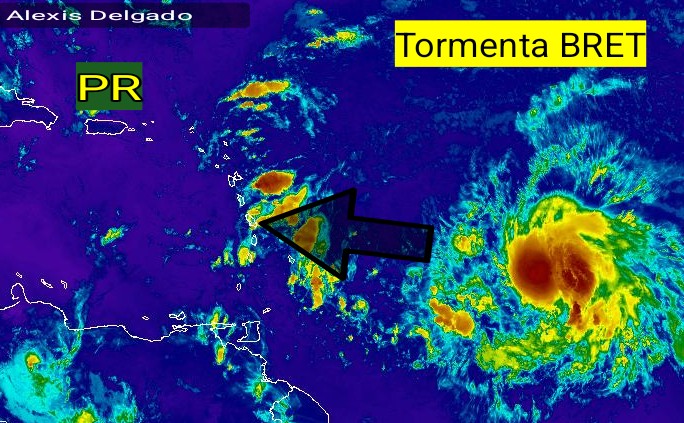 ➡️Estoy marcando la debil Onda Tropical que se encuentra actualmente en las Antillas Menores,estará esa humedad nosotros durante el día de hoy provocando algunas lluvias , pero nada tiene que ver hoy con Bret.