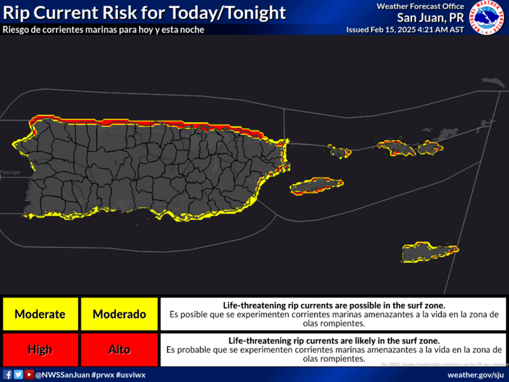 Los vientos fluctuan de 20-33 mph en especial costas del sur,norte y costa este .En el Mar 🌊 precaucion zona norte y este por varias advertencias (Riesgo de corrientes marinas )ademas advertencia para operadores de embarcaciones pequeñas.vea el mapa